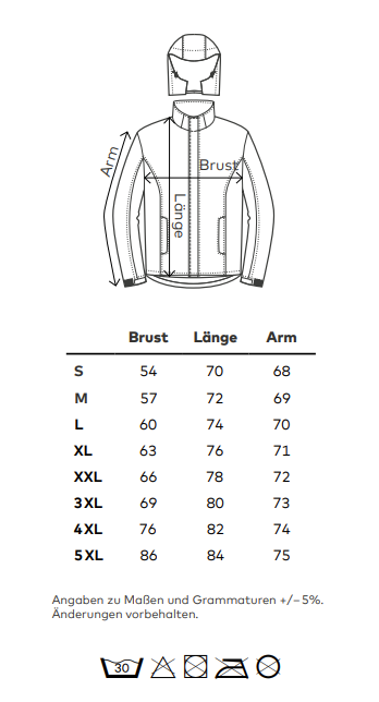 Jacke, abnehmbare und volumenregulierbare Kapuze, wasserdichte Reißverschlüsse, Kinnschutz, Napoleontasche, Ärmeltasche, verstellbare Armabschlüsse mit Klettverschluss, Tunnelzug am Saum mit Kordelstopper innen, verlängertes Rückenteil mit abgerundetem Saum, 2 Seitentaschen mit Reißverschluss, eingenähter Schlüsselanhänger in Seitentasche, reflektierende Paspeln und Reißverschlussanhänger, Teilungsnähte, neutrales Größenetikett, atmungsaktiv, wasserdicht 8.000 mm, winddicht, Softshell-Bonded-Fleece bi-elastisch, Außenmaterial 95 % Polyester, 5 % Elasthan, Innenmaterial 100 % Polyester, 310 g/m².